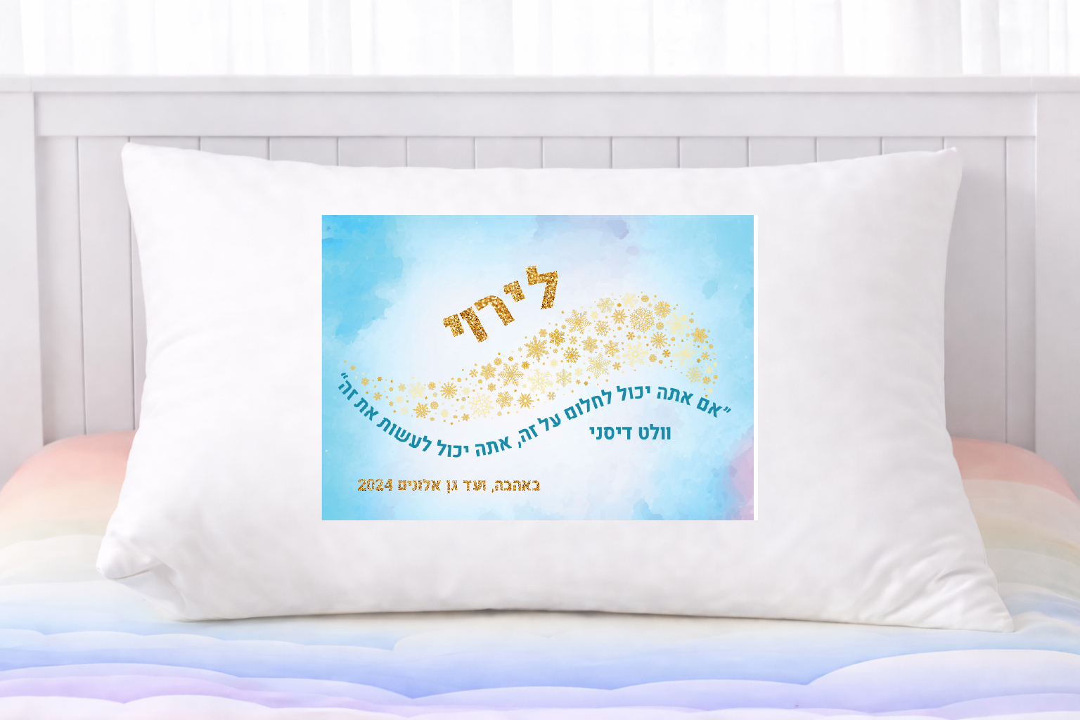 מתאים למיטת יחיד בגודל 2.00 מטר על 95 ס"מ רוחב + ציפית לכרית בגודל 50 על 70 ס"מ עם הדפסת עיצוב ושם הילד/ה על הכרית בגודל 4