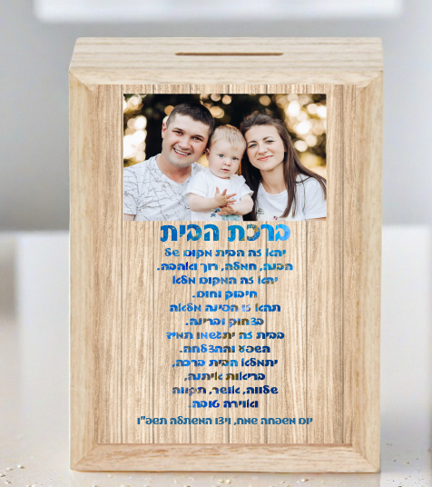 קופת חיסכון מעץ מלא עם תמונה משפחתית