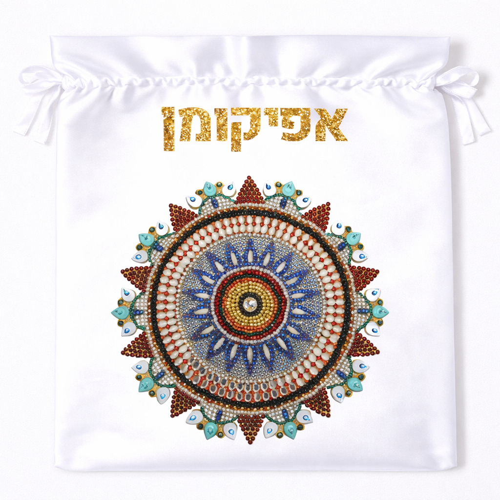 שקית אפיקומן מרשימה מסאטן לבן עם מיתוג והדפסה לבחירה ממבחר העיצובים,