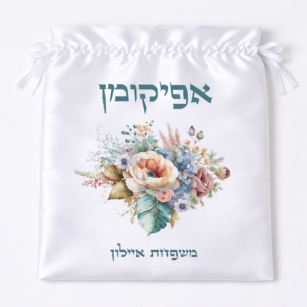 שקית אפיקומן מרשימה מסאטן לבן עם מיתוג והדפסה לבחירה ממבחר העיצובים,