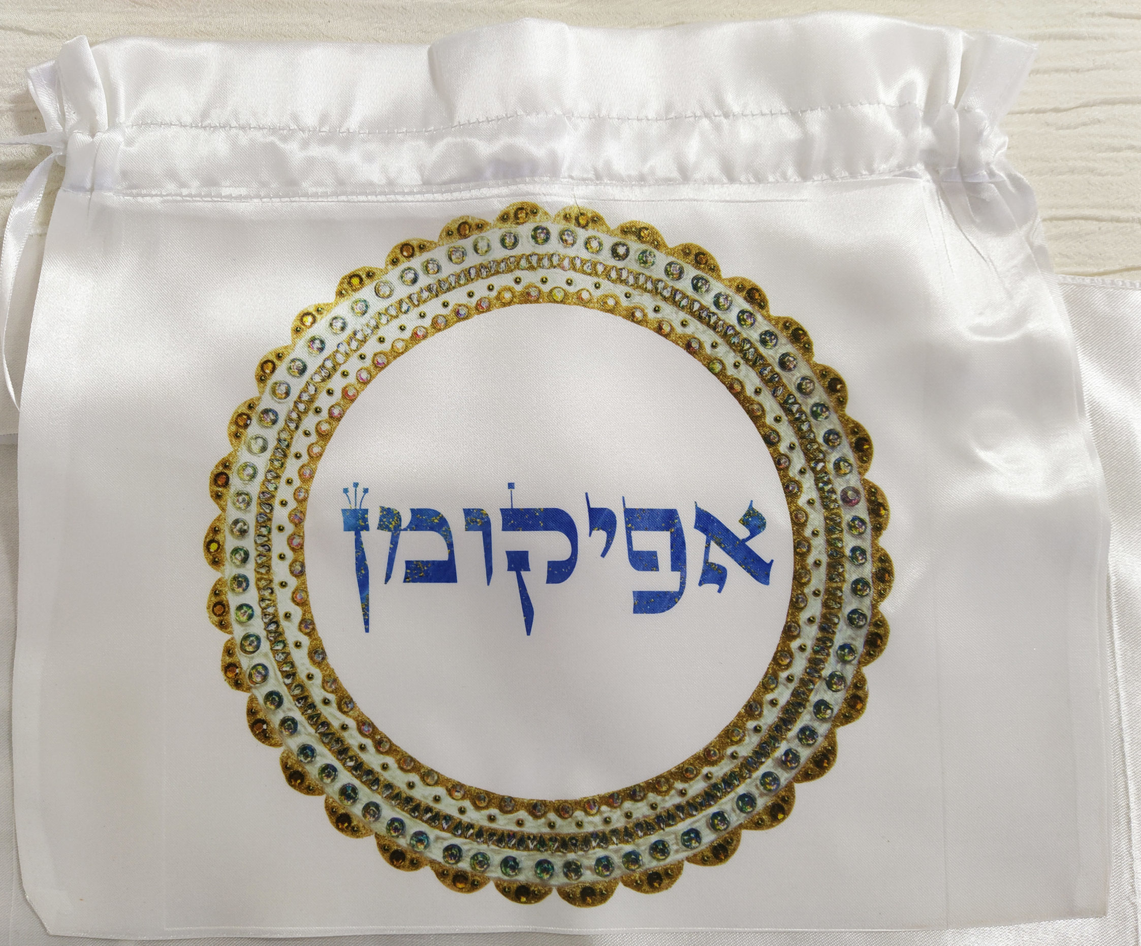 שקית אפיקומן מרשימה מסאטן לבן עם מיתוג והדפסה לבחירה ממבחר העיצובים,