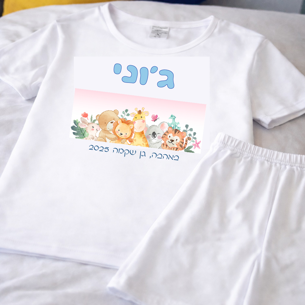 פיג'מה (מכנס קצר וחולצה קצרה) רכה ואיכותית מודפסת עם שם הילד/ילדה
