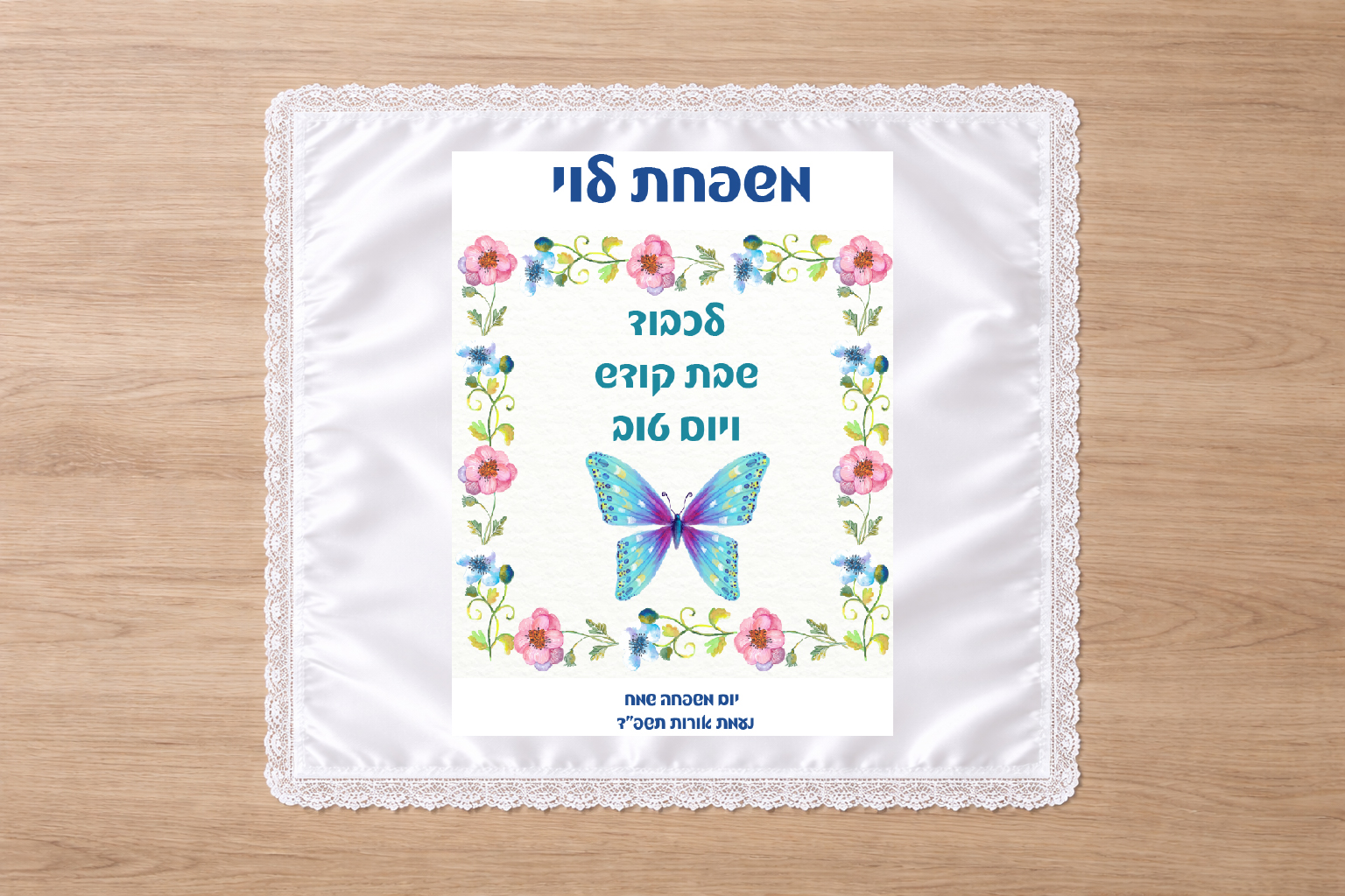 כיסוי חלה גדול ומהודר מסאטן לבן עם שול תחרה לבן עם שם המשפחה של הילד/ה