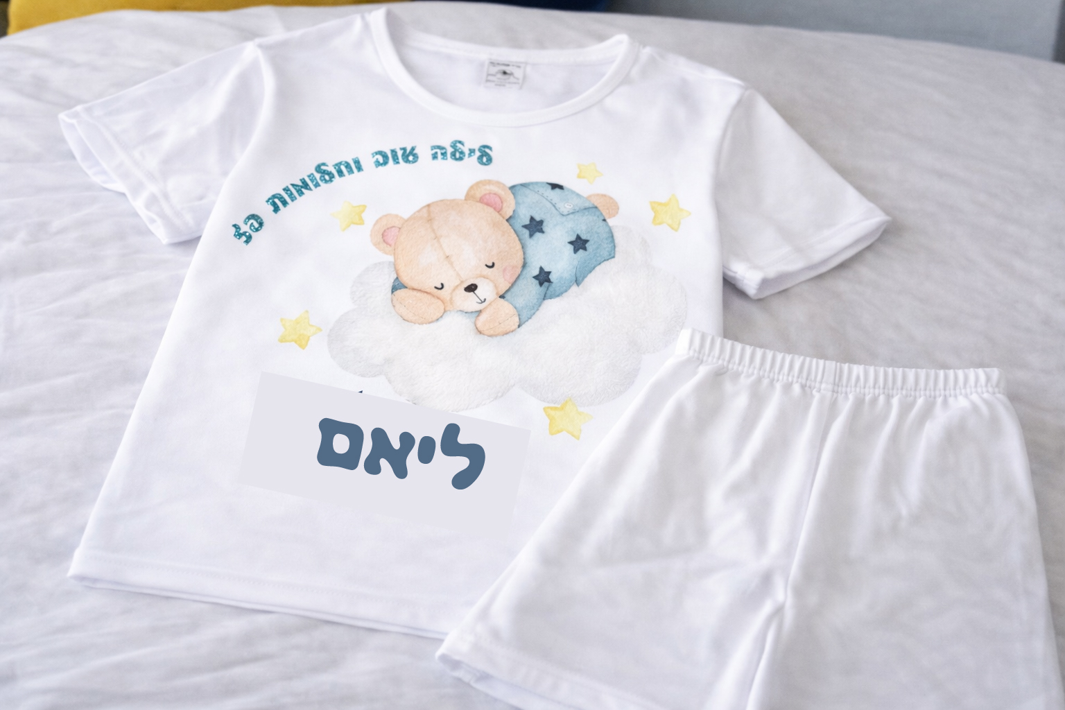 פיג'מה (מכנס קצר וחולצה קצרה) רכה ואיכותית מודפסת עם שם הילד/ילדה
