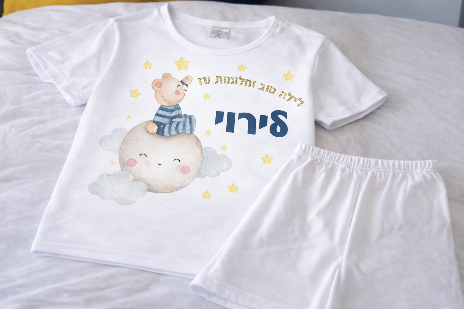פיג'מה (מכנס קצר וחולצה קצרה) רכה ואיכותית מודפסת עם שם הילד/ילדה