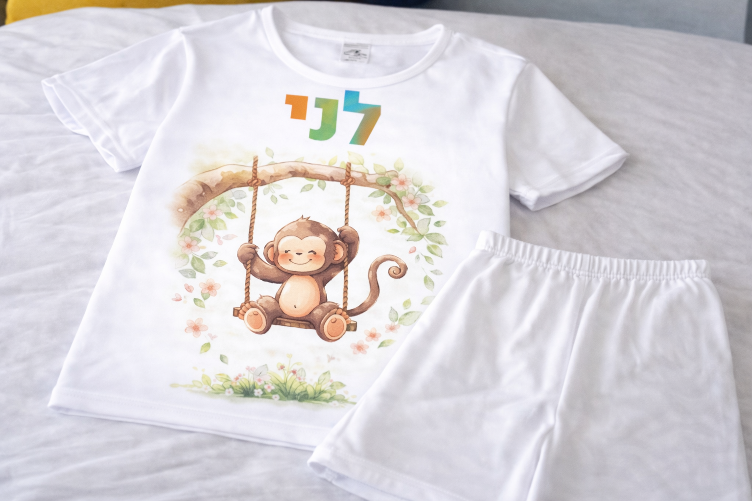 פיג'מה (מכנס קצר וחולצה קצרה) רכה ואיכותית מודפסת עם שם הילד/ילדה