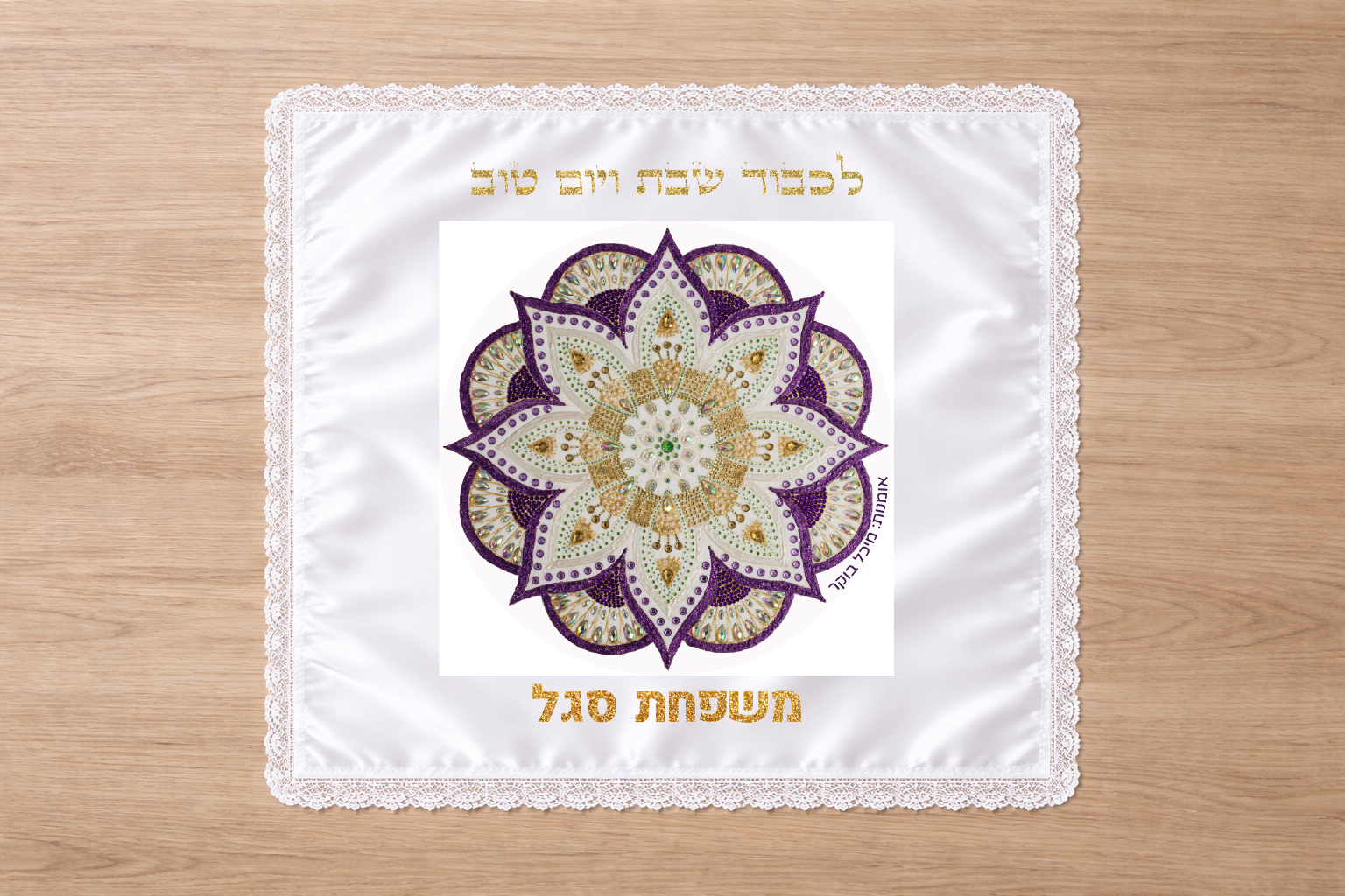 כיסוי חלה גדול ומהודר מסאטן לבן עם שול תחרה לבן עם שם המשפחה של הילד/ה