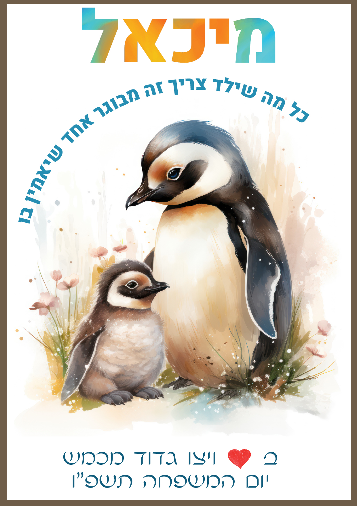 תמונה מאוירת עם משפט העצמה + שם הילד/ה + לוגו והקדשה (אפשר לשנות את הכיתוב והמשפטים כרצונכם).