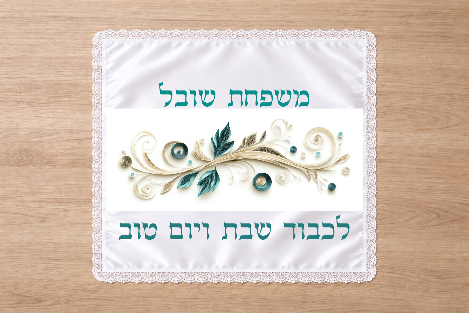 כיסוי חלה גדול ומהודר מסאטן לבן עם שול תחרה לבן עם שם המשפחה של הילד/ה