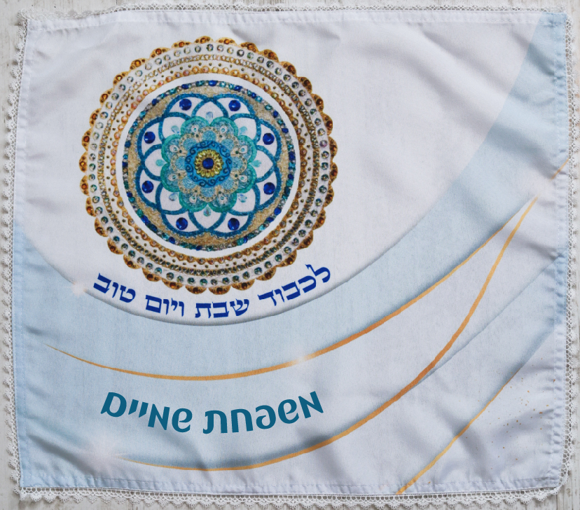 כיסוי חלה גדול ומהודר עם הדפס מלא עם שול תחרה לבן ואפשר להוסיף מיתוג ושם משפחה