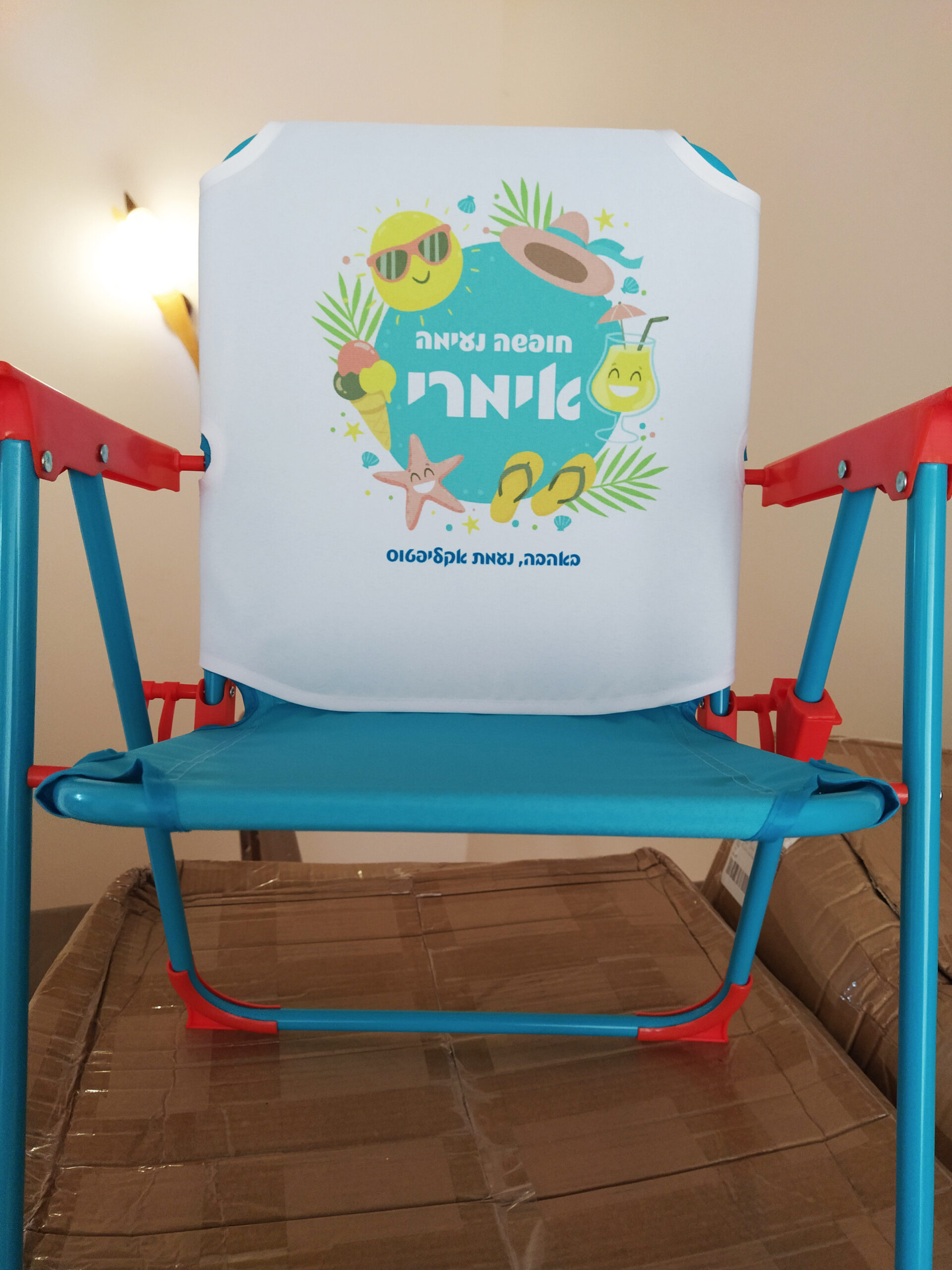 כיסא ים מתקפל עם נעילת ביטחון כולל דפוס עם שם הילד/ה ושם המעון/הגן