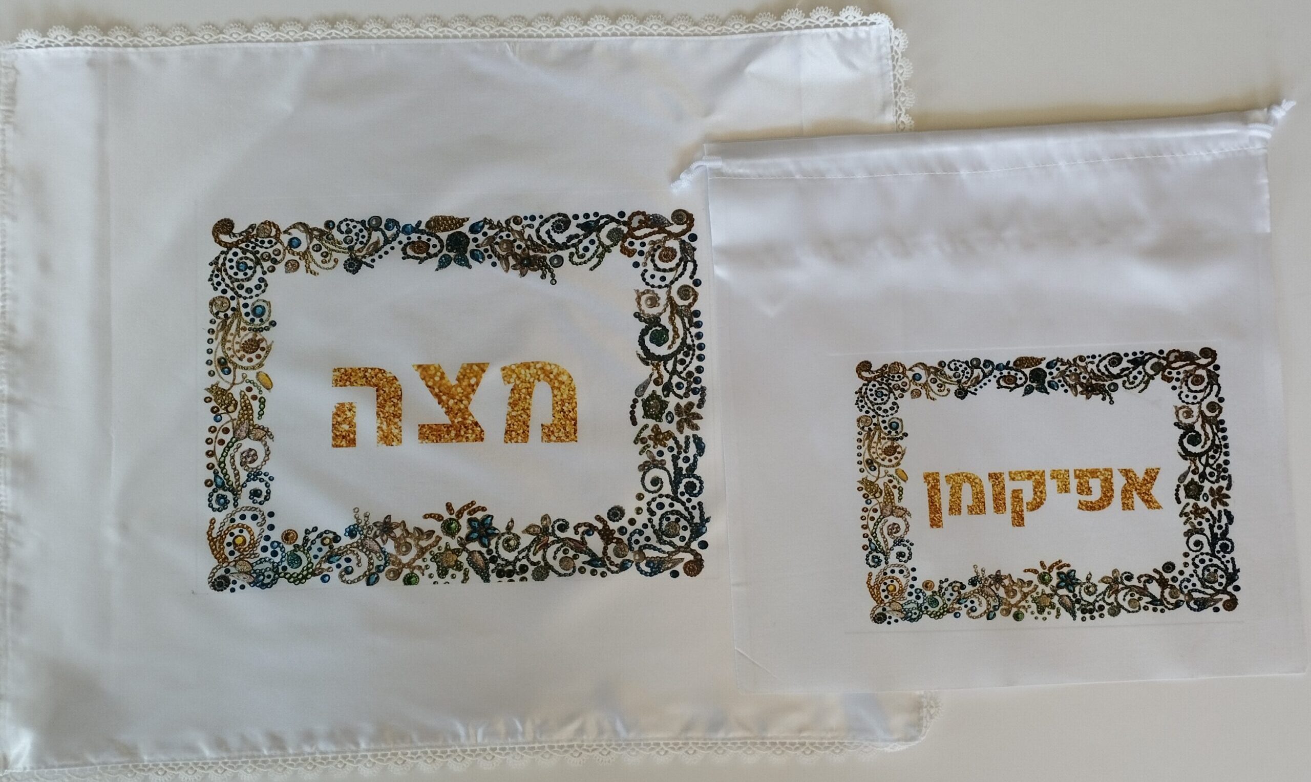 כיסוי מצה מסאטן עבה בגודל 44X50 ס"מ עם שול תחרה לבנה + שקית אפיקומן מסאטן בגודל 28X28 ס"מ