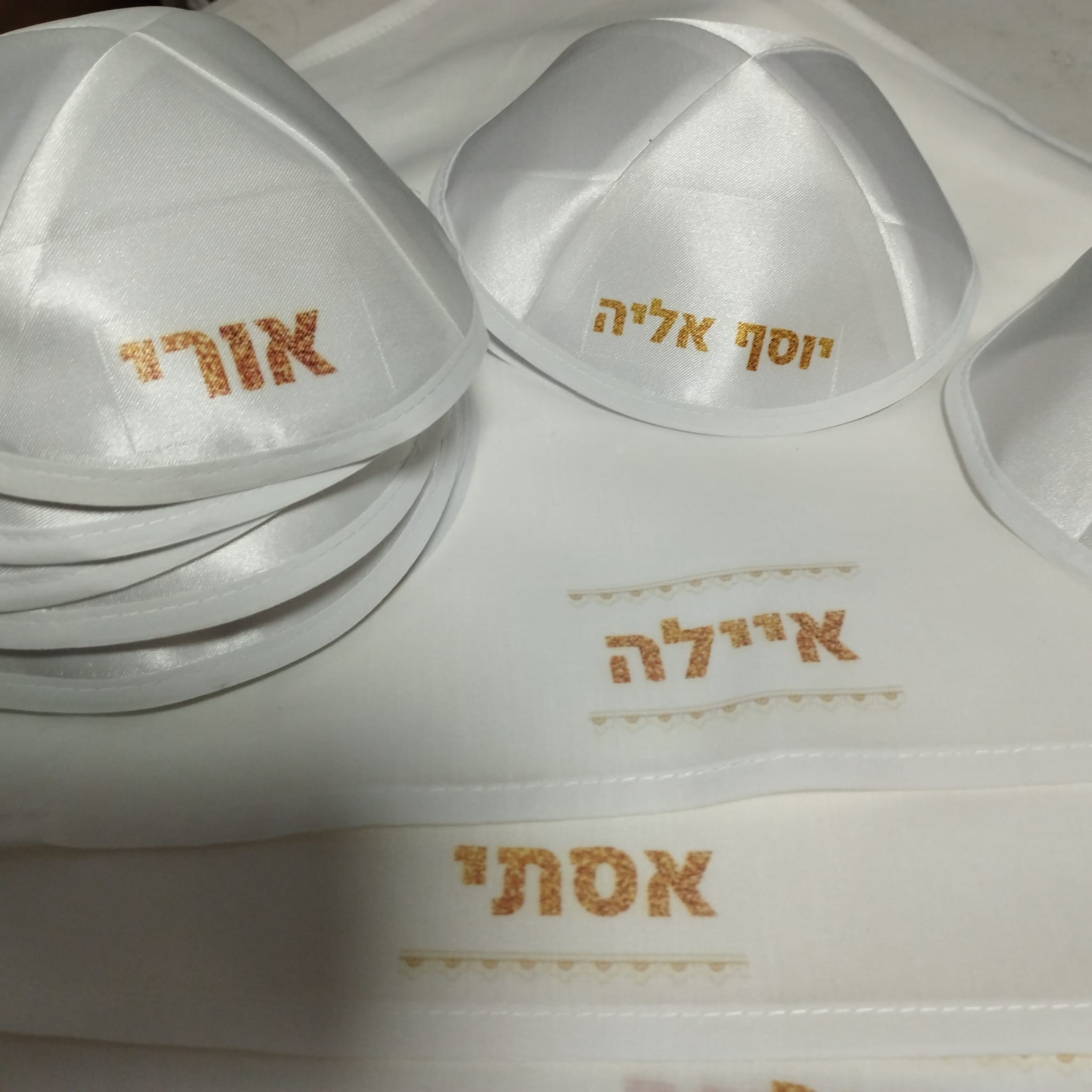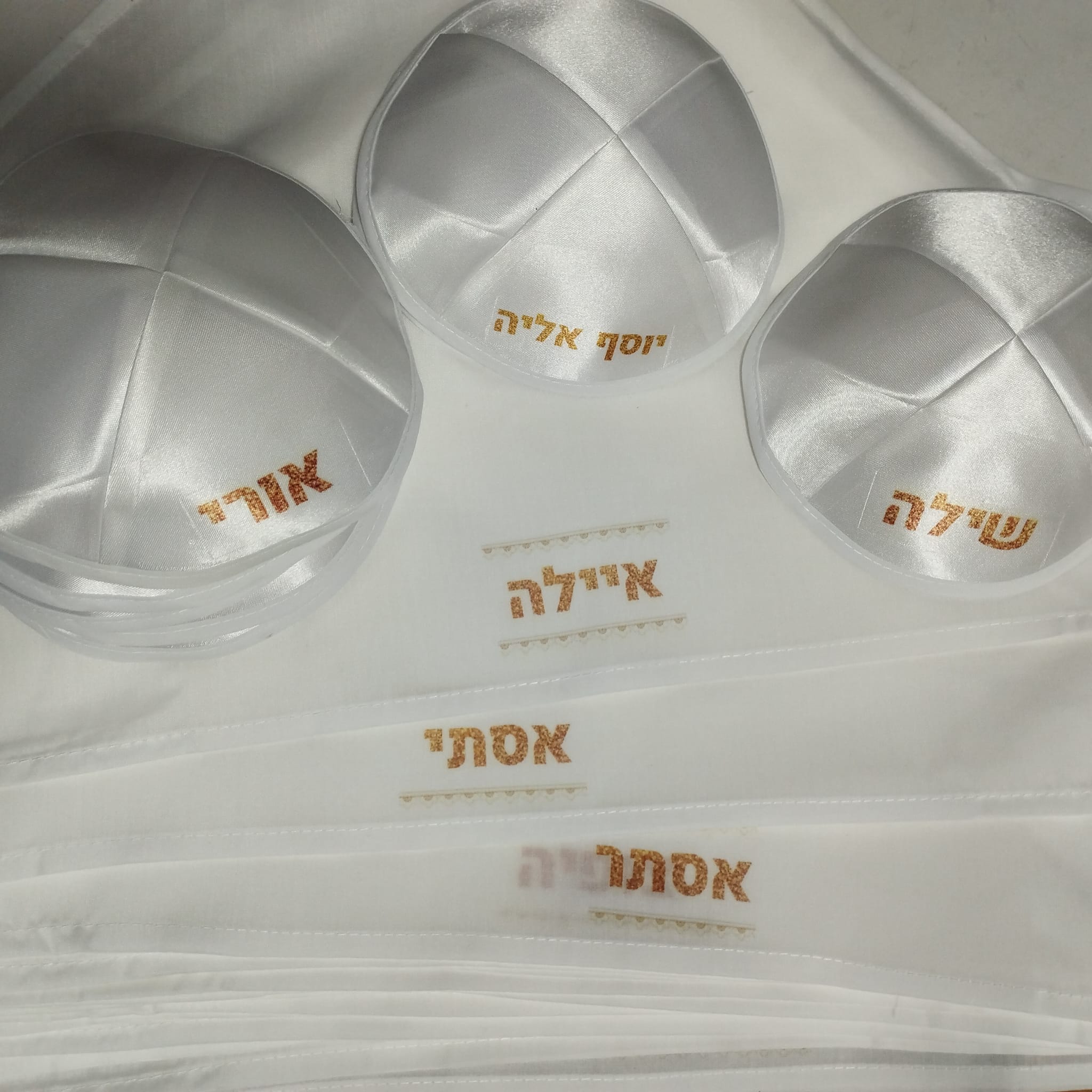 כיפות לבנות לבנים ומטפחות לבנות עם שם מודפס בזהב