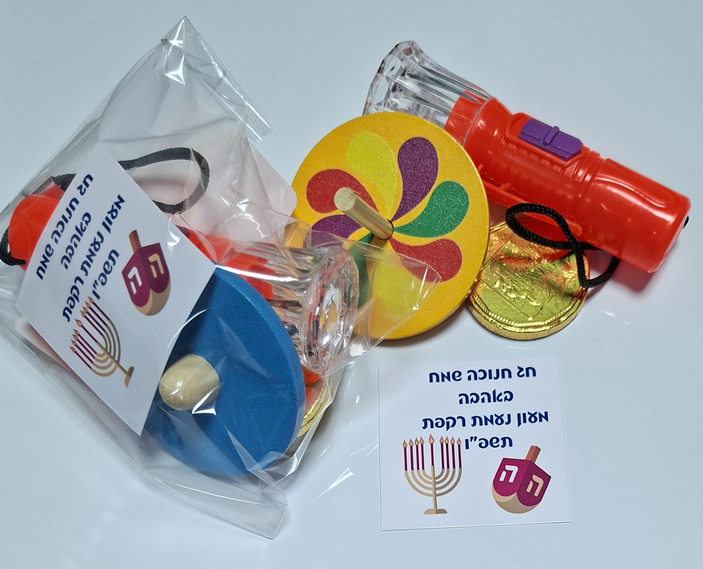 בשקית צלופן חמודה כל ילד יקבל סביבון עץ צבעוני או סביבון אורות לד קטן + פנס לד (אנחנו בודקים שכל פנס עובד)+ מטבע שוקולד וכרטיס ברכה מהגן