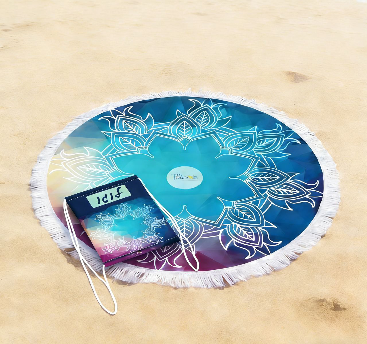מגבת חוף גדולה בקוטר 150 ס"מ עם אפשרות להוספת מיתוג + תיק קנבס חזק בדפוס תואם.