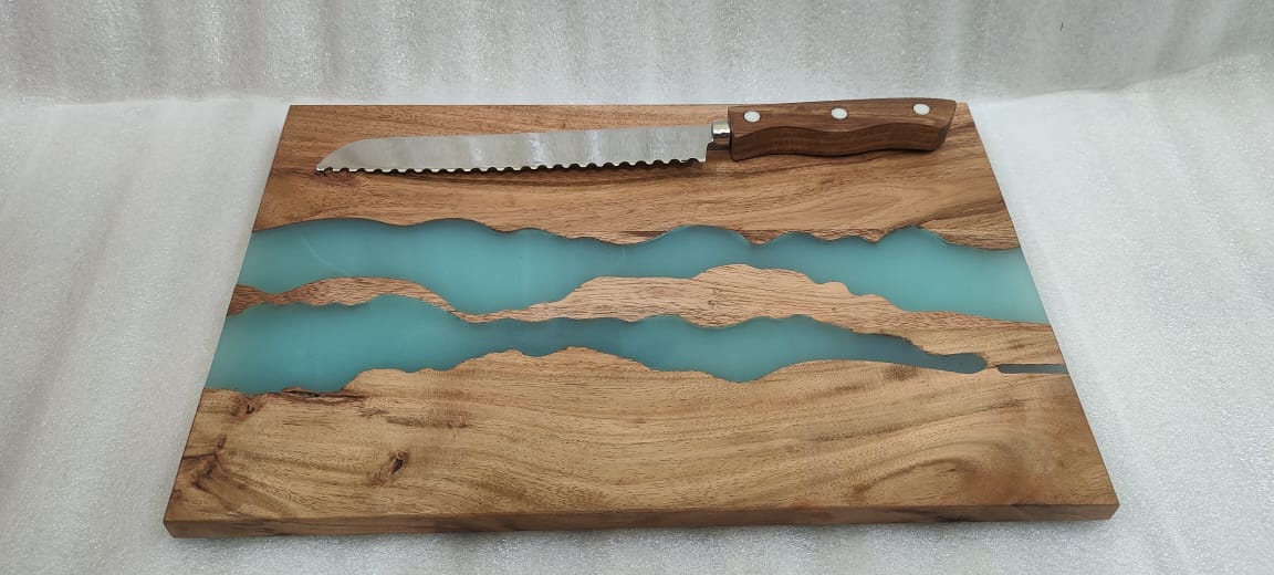מארז קרש חיתוך מעץ טבעי בשילוב טורקיז ים + סכין נירוסטה איכותי עם ידית עץ .