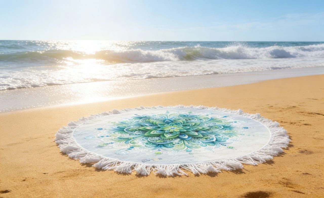 מגבת חוף גדולה בקוטר 150 ס"מ עם אפשרות להוספת מיתוג מוגשת באריזת מתנה!