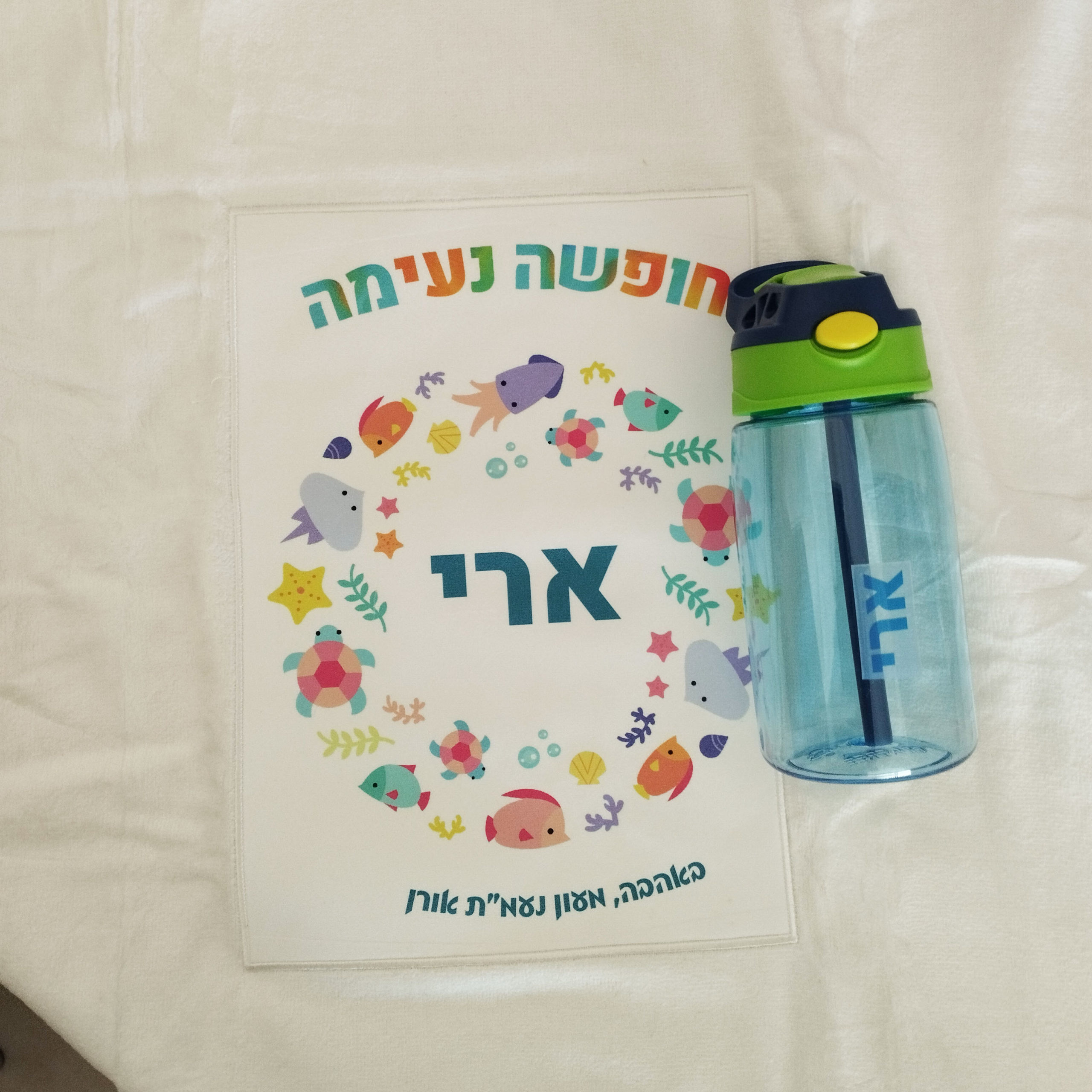 גודל המגבת 120X60סמ+ קפוצ'ון. הבקבוק עם שם הילד במדבקה שקופה עמידה בנוזלים