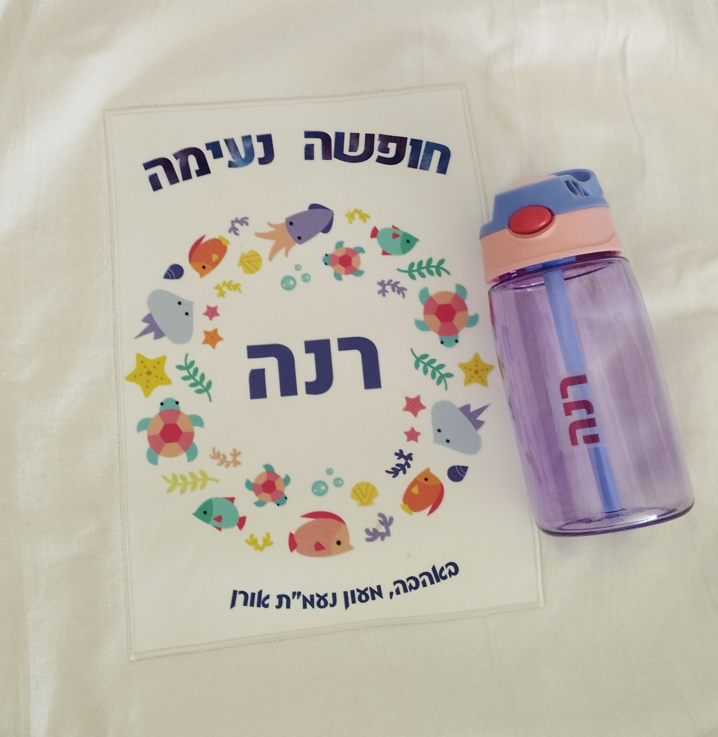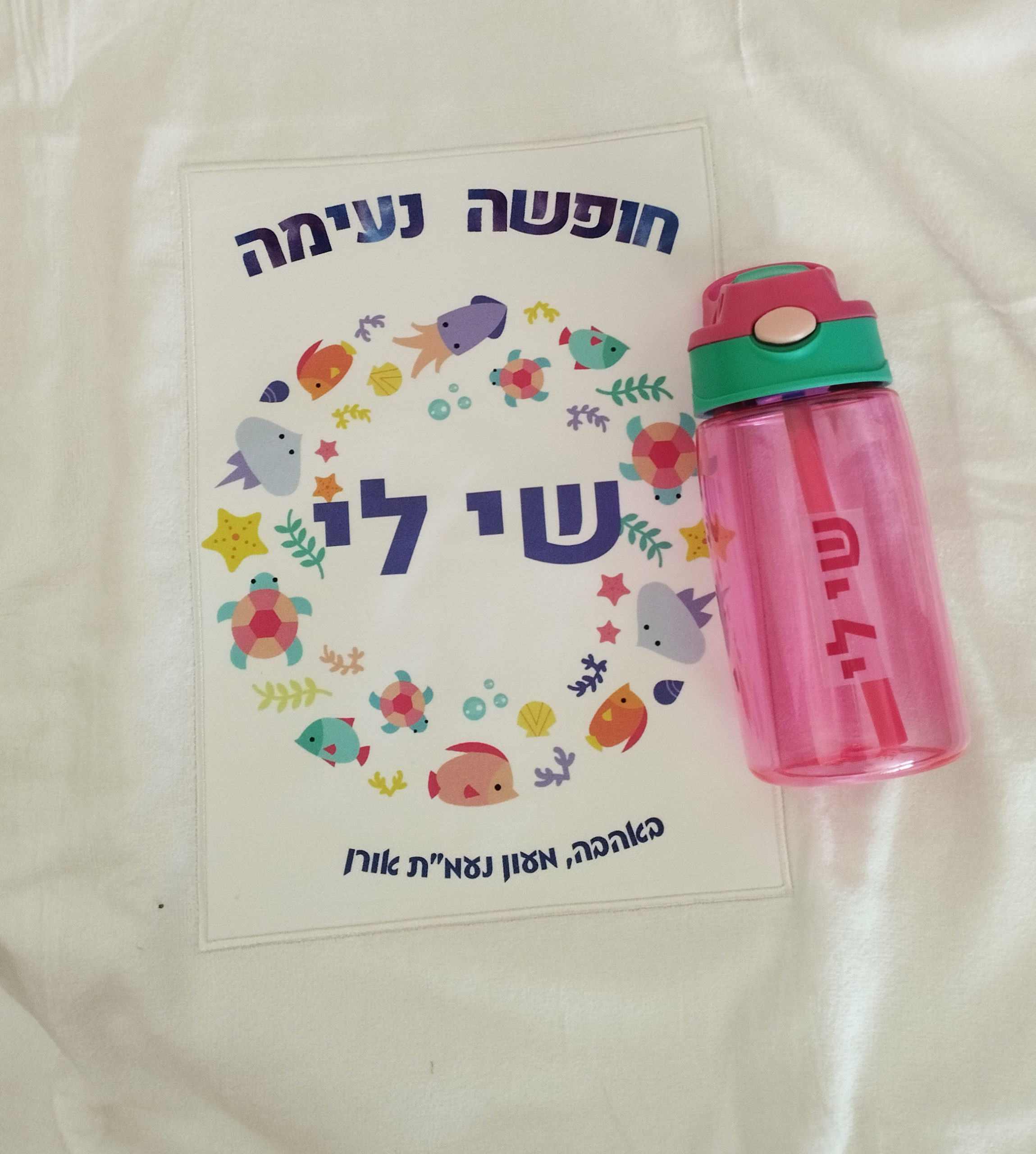 גודל המגבת 120X60סמ+ קפוצ'ון. הבקבוק עם שם הילד במדבקה שקופה עמידה בנוזלים