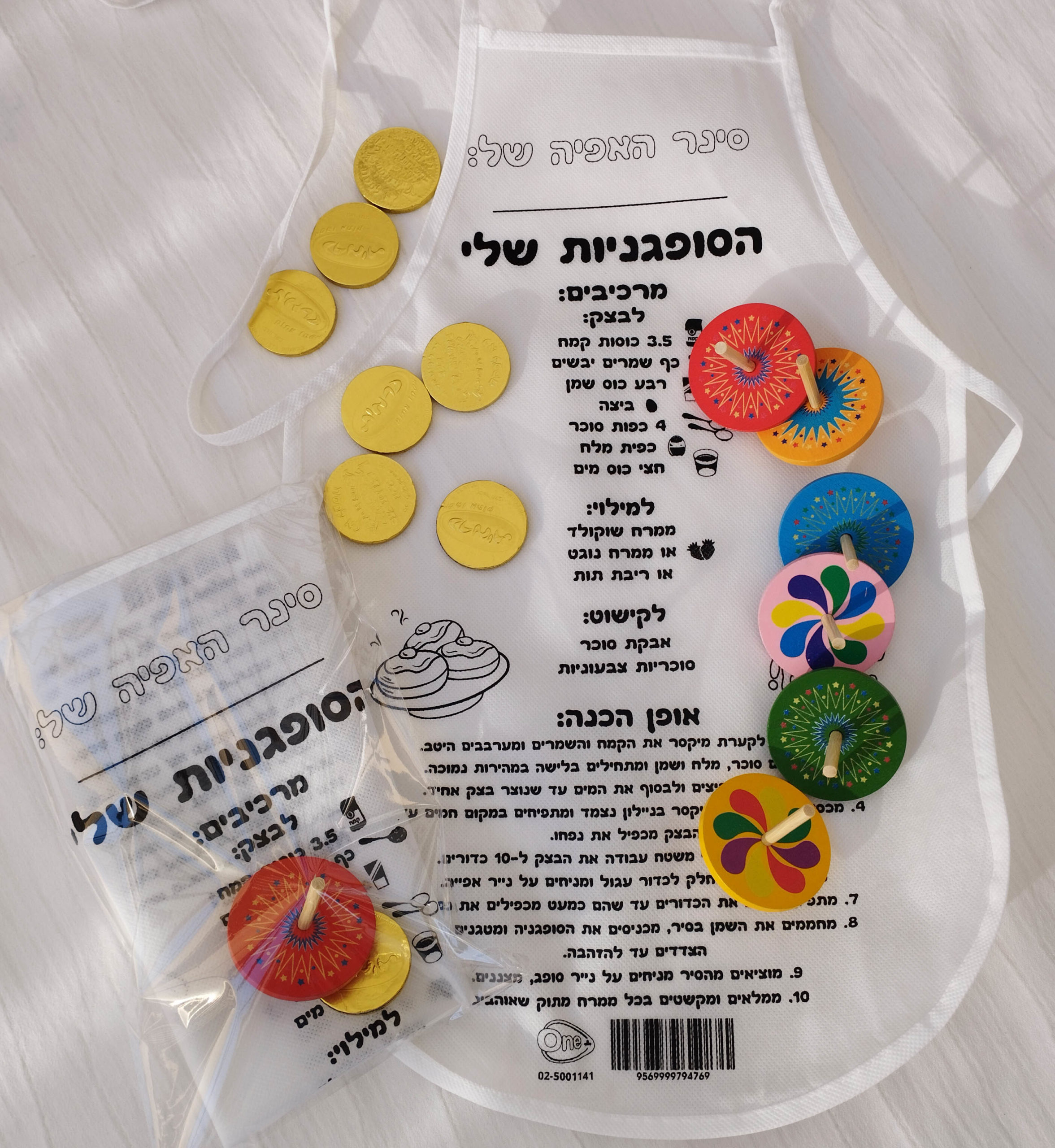 סינר אפיה עם מתכון לסופגניות + סביבון עץ צבעוני איכותי + מטבע שוקולד גדול