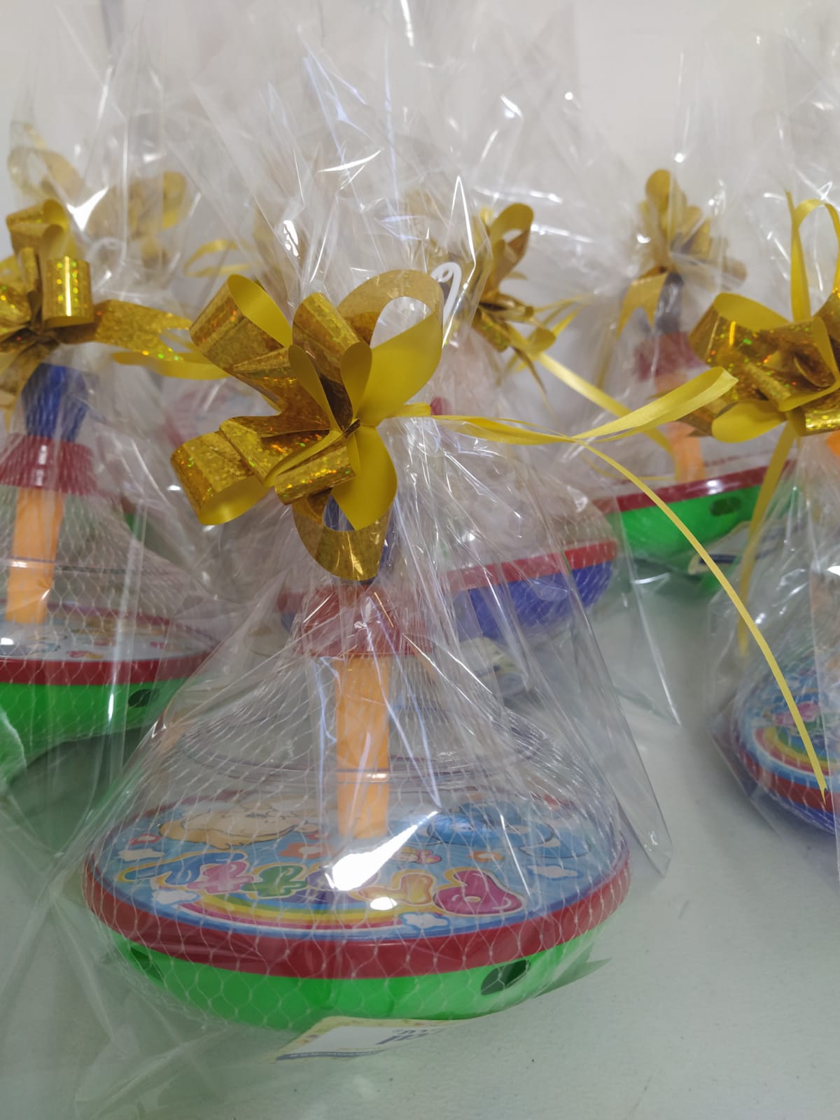 סביבון צעצוע ענק צבעוני בקוטר 11 ס"מ, מופעל עם ידית, ארוז ברשת – כמו בתמונה