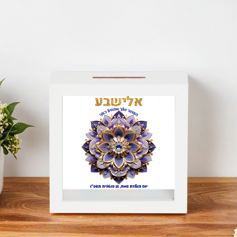 קופת חיסכון איכותית מעץ לבן עם חזית שקופה עם שם הילד/ה – לא שביר!