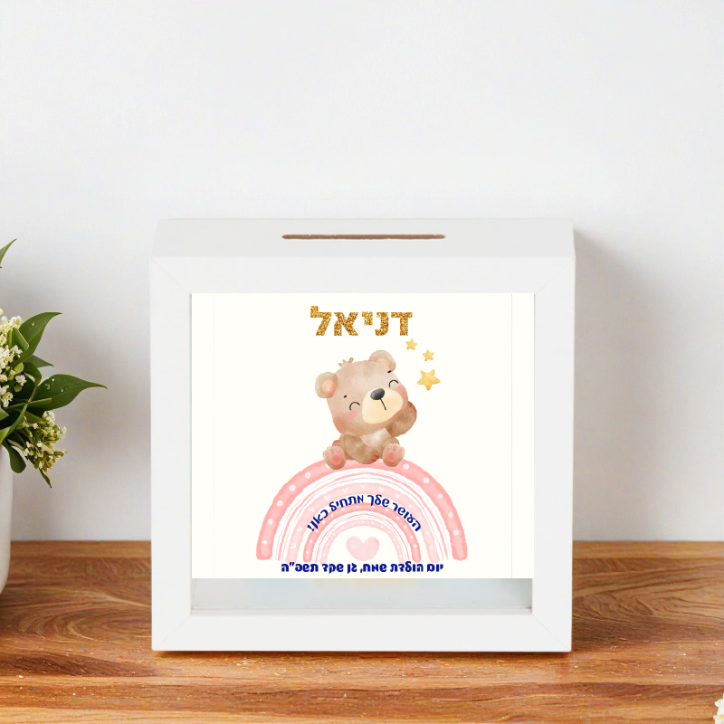 קופת חיסכון איכותית מעץ לבן עם חזית שקופה עם שם הילד/ה – בטיחותי – לא זכוכית!