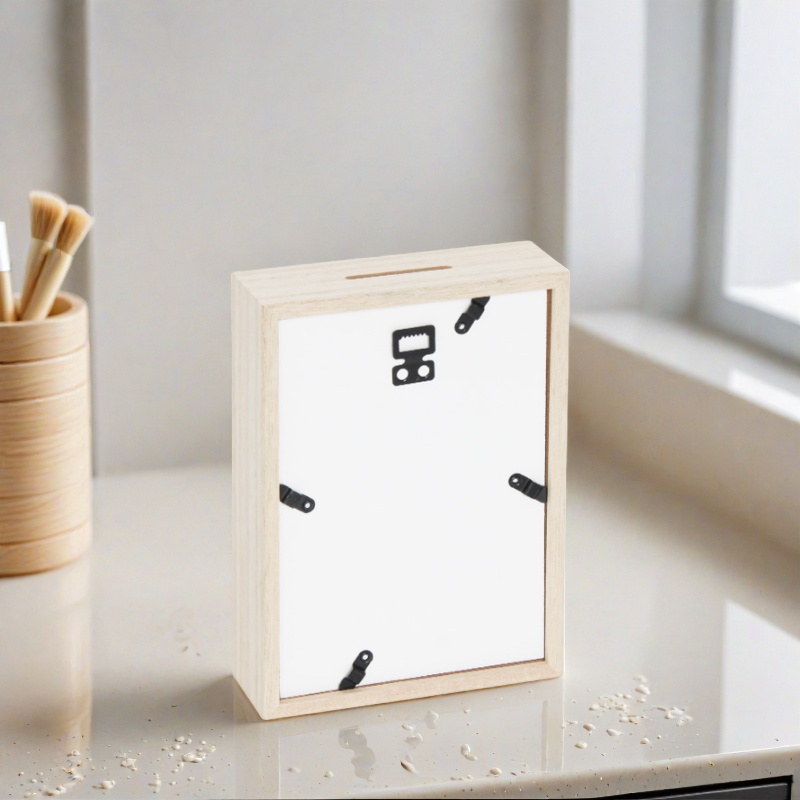 קופת חיסכון איכותית מעץ טבעי עם חזית שקופה עם שם הילד/ה – בטיחותי – לא זכוכית!