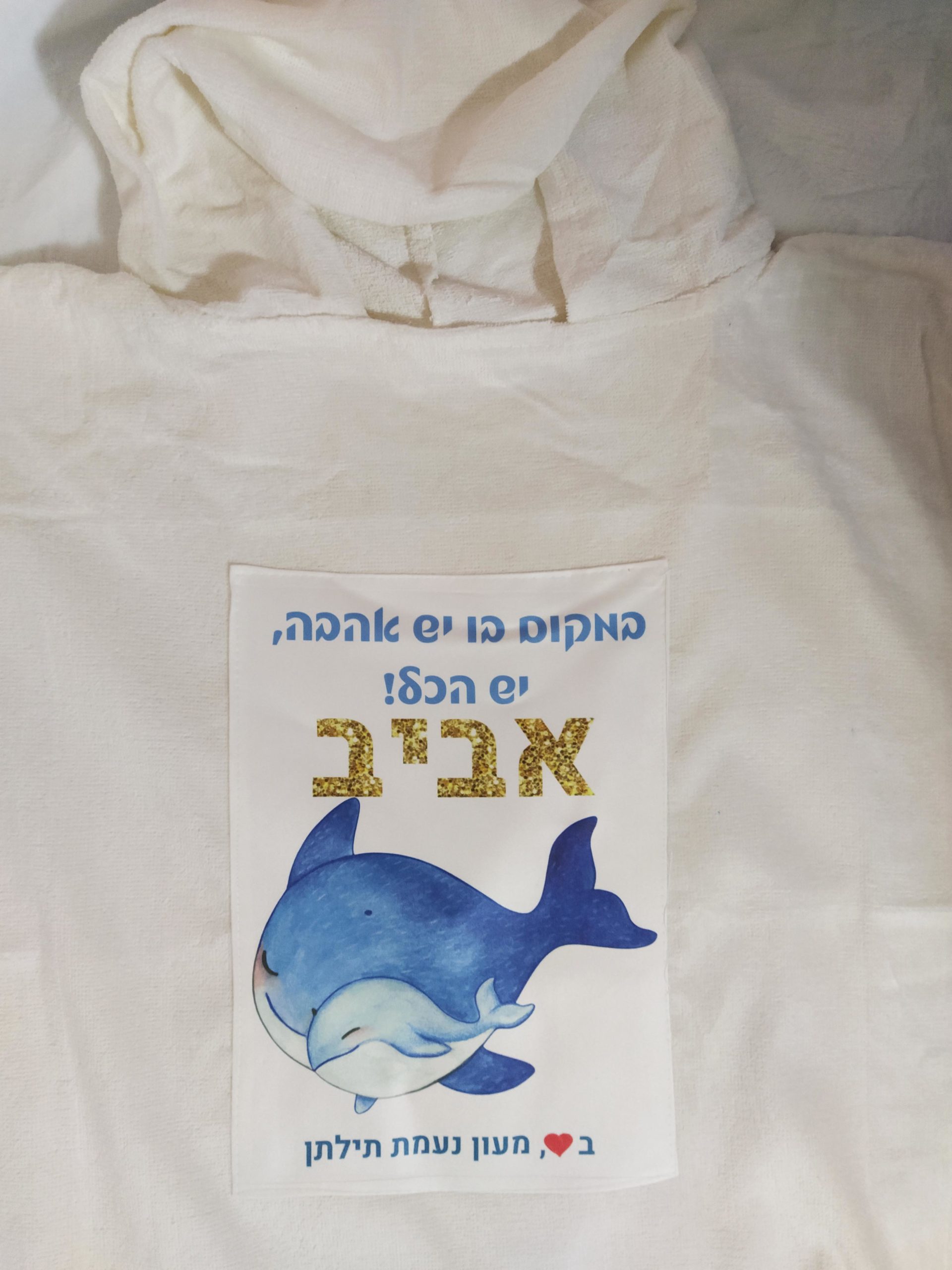 קפוצ'ון מגבת 100% כותנה עם הדפסה, שם הילד/ה והקדשה מהגן (הדפסה בגודל 4A)