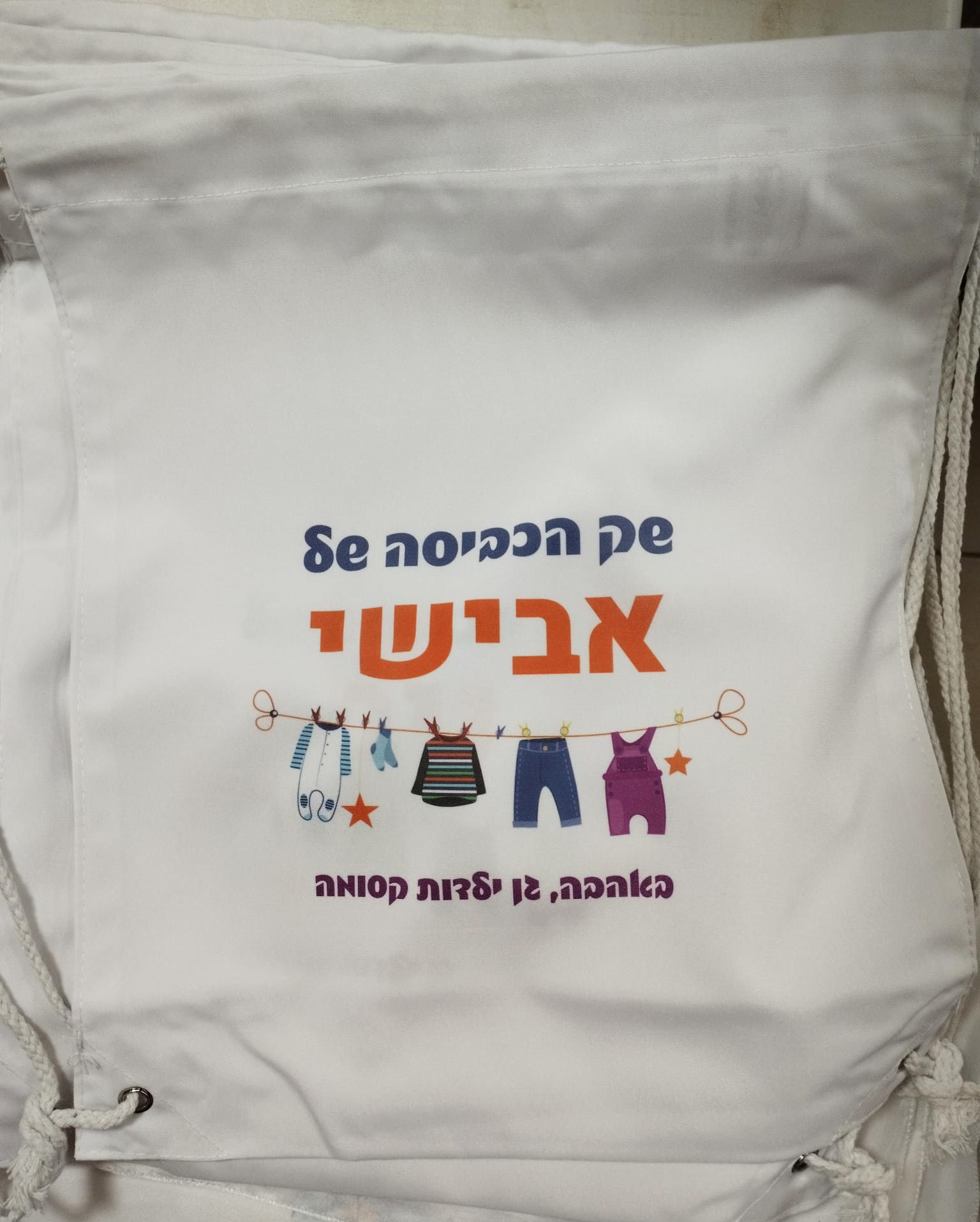 שק כביסה מבד איכותי וחזק עם שרוכים לנשיאה מודפס עם שם הילד או לוגו